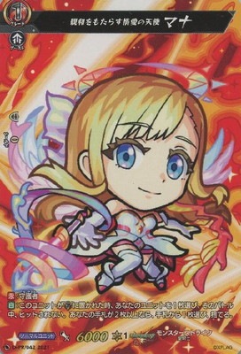 親和をもたらす情愛の天使 マナ (シンワヲモタラスジョウアイノテンシ マナ) ノーマルユニット モンスターストライク 聖騎士 グレード 1 パワー 6000 クリティカル 1 シールド 0 ブースト - 【永】:守護者 【自】:このユニットが(G)に置かれた時、あなたのユニットを1枚選び、そのバトル中、ヒットされない。あなたの手札が2枚以上なら、手札から1枚選び、捨てる。 - スタンダード D-PR/042 PR (C)XFLAG