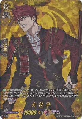 大包平 (おおかねひら) ノーマルユニット 刀剣乱舞 刀剣男士-太刀 グレード 2 パワー 10000 クリティカル 1 シールド 5000 インターセプト - 【自】【(R)】:このユニットがブーストされないでアタックした時、【コスト】[手札から2枚捨てる]ことで、このユニットよりパワーの高い、あなたのユニットを1枚選び、そのバトル中、このユニットのパワーを、そのユニットのパワーより5000高くなるまで増減させる。 - スタンダード D-TB01/TRR18 TRR (C)2015 EXNOA LLC/Nitroplus