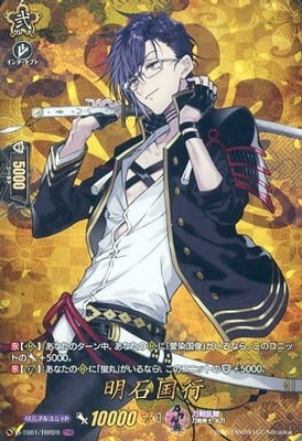 明石国行 (あかしくにゆき) ノーマルユニット 刀剣乱舞 刀剣男士-太刀 グレード 2 パワー 10000 クリティカル 1 シールド 5000 インターセプト - 【永】【(R)】:あなたのターン中、あなたの(R)に「愛染国俊」がいるなら、このユニットのパワー+5000。 【永】【(G)】:あなたの(R)に「蛍丸」がいるなら、このユニットのシールド+5000。 - スタンダード D-TB01/TRR20 TRR (C)2015 EXNOA LLC/Nitroplus