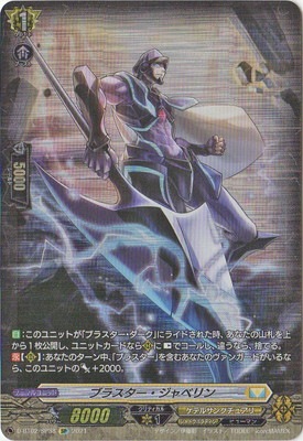 ブラスター・ジャベリン (ブラスター・ジャベリン) ノーマルユニット ケテルサンクチュアリ ヒューマン シャドウパラディン グレード 1 パワー 8000 クリティカル 1 シールド 5000 ブースト - 【自】:このユニットが「ブラスター・ダーク」にライドされた時、あなたの山札を上から1枚公開し、ユニットカードなら(R)に【レスト】でコールし、違うなら、捨てる。 【永】【(R)】:あなたのターン中、「ブラスター」を含むあなたのヴァンガードがいるなら、このユニットのパワー+2000。 - スタンダード D-BT02/SP38 SP デザイン/伊藤彰 イラスト/TODEE
